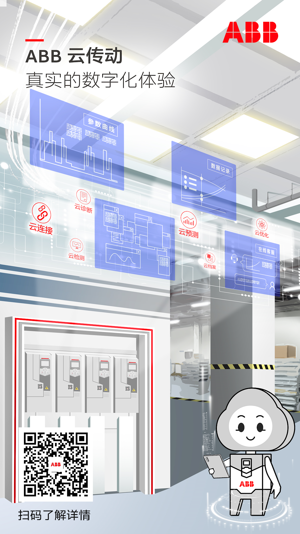- ABB云传动将ABB在变频器行业的专家知识借助物联网、云计算与人工智能等技术应用到变频器的智能诊断与寿命预测和优化上,帮助用户缩短停机时间,提高生产效率,实现智能化运维。