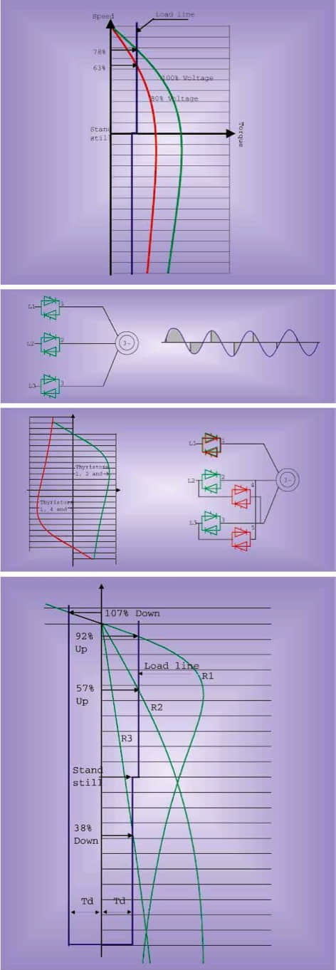 各相采用一对可控硅,电压可在0至最大线电压范围内平滑调整。微处理器通过调节可控硅触发角,控制可控硅开放状态,从而增大或减小加到电机定子上的电压。无需接触器换向,正向转矩由成可控硅组1、2和3获得,反向转矩由可控硅组1、4和5获得。转矩方向的变换时间小于20ms。通过改变电机外部转子的电阻,可以控制在任意速度下绕线电动机的转矩。仅通过改变电阻,就可获得92%和57%的上升速度及38%的下降速度。这种特性多年以来一直被起重机电动机所采用。