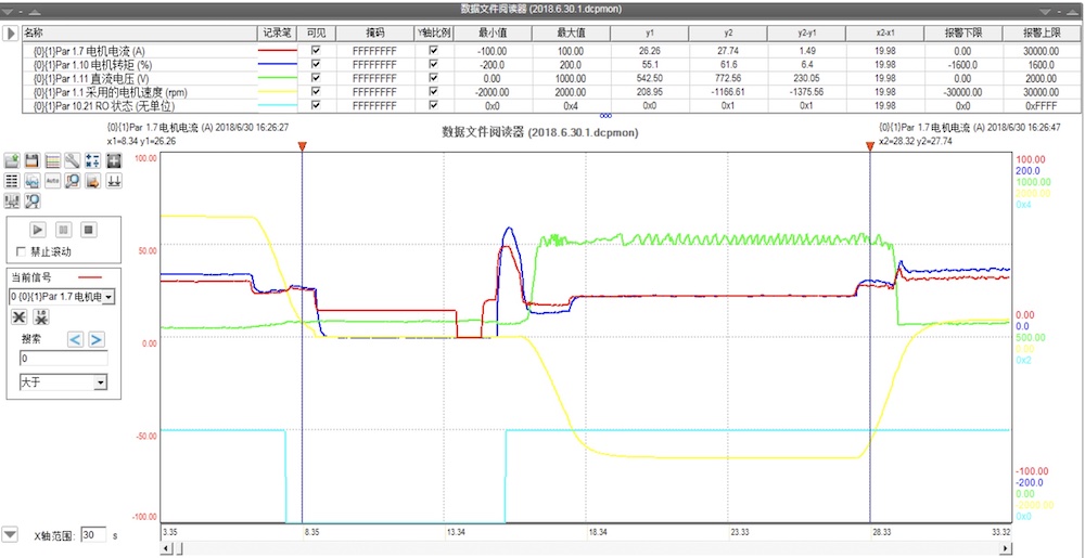 电缆厂记录的主提升变频器状况。监控的参数曲线可根据情况选择,下图选择监控的为电机电