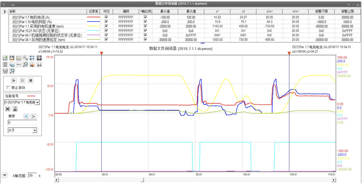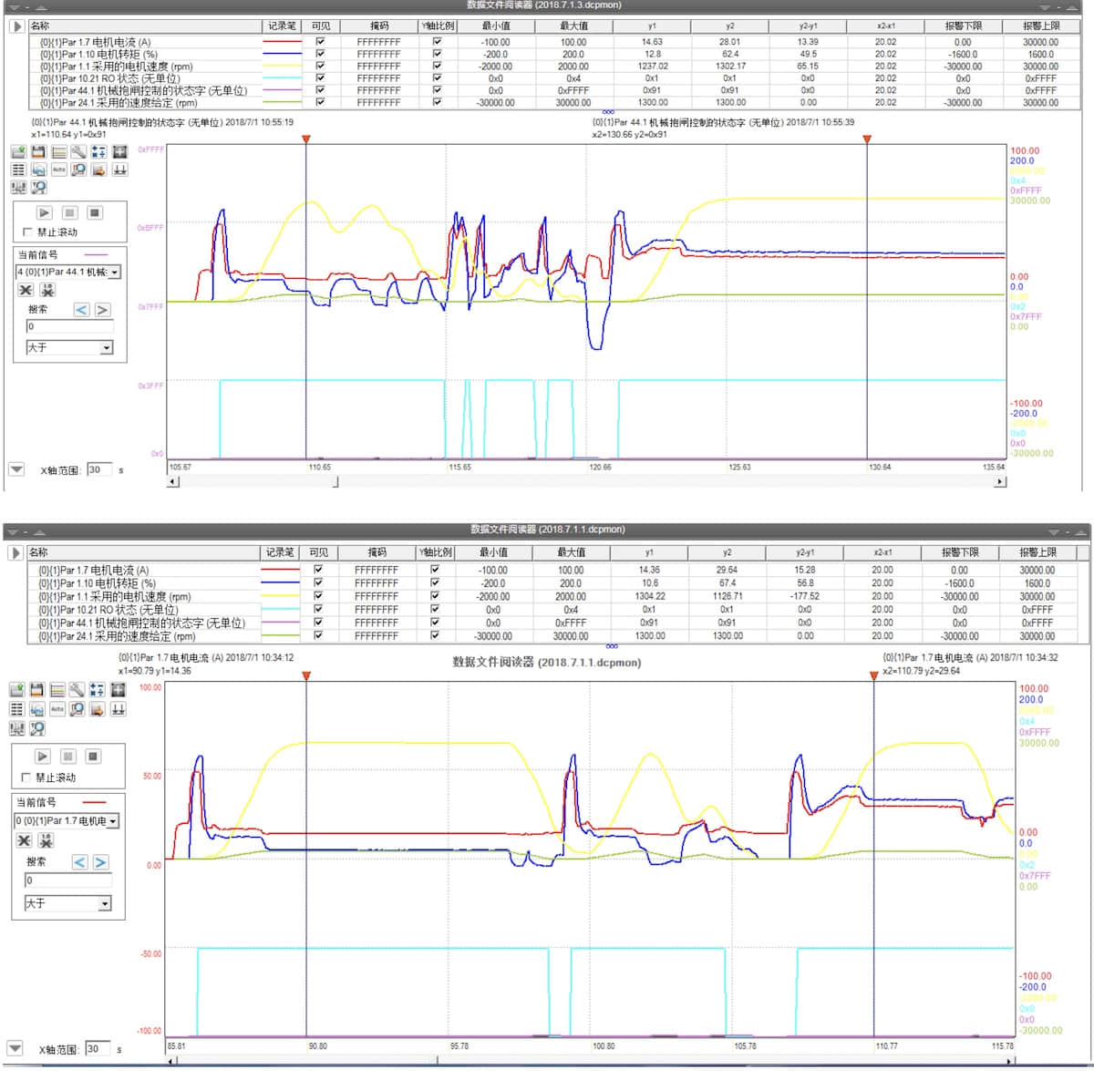 下图选择监控的为电机电流、电机转矩、母线直流电压、电机实际转速、制动器的状态、制动器控制逻辑状态、给定速度。